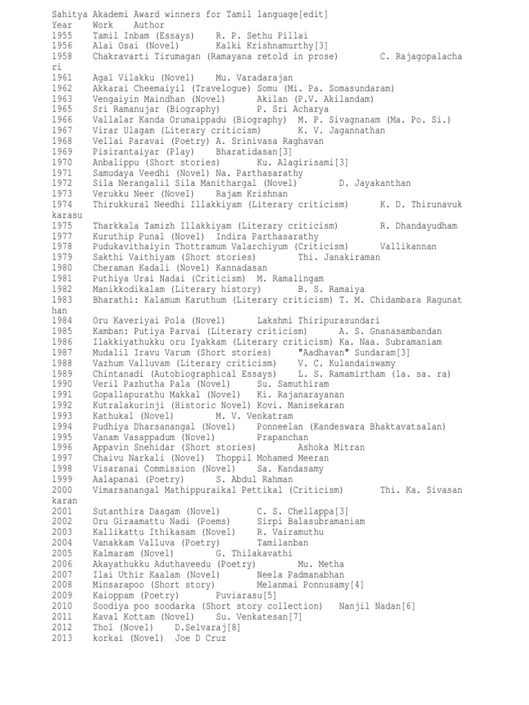 List Of Sahitya Akademi Award Winners For Tamil Wikipedia The Free Encyclopedia Languages Of India South India - Sahitya akademi award jest drugim najwyzszym wyroznieniem literackim w indiach.